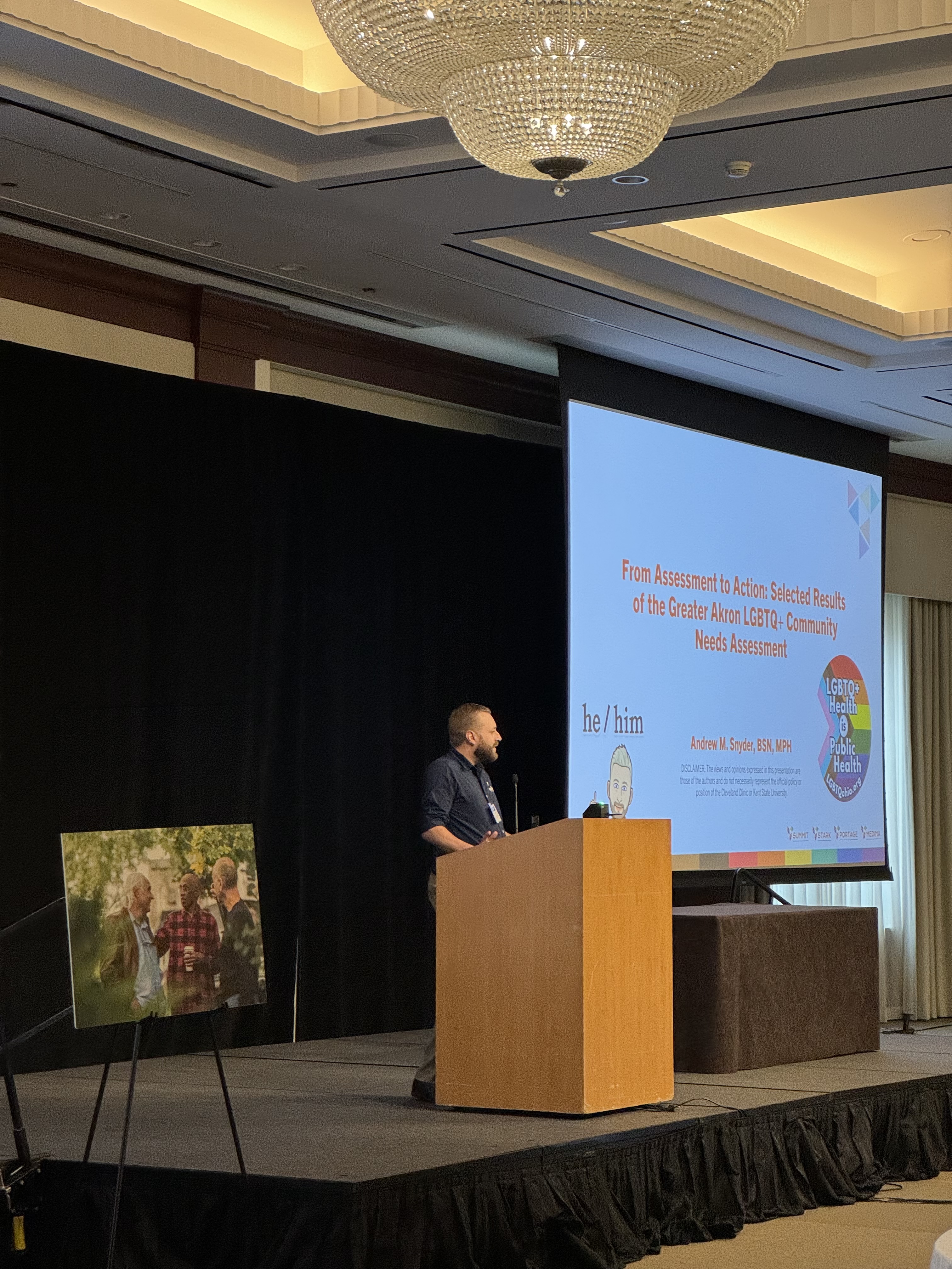 Andrew is also an accomplished speaker, regularly presenting his research at prestigious conferences and in community settings. His expertise in LGBTQ+ health equity and the social determinants of health has made him a sought-after presenter at events such as the American Public Health Association Annual Meeting and the Cleveland Clinic Social Determinants of Health Annual Meeting. Through these presentations, Andrew continues to disseminate knowledge that influences public health practices and policies, further solidifying his role as a leader in the field.