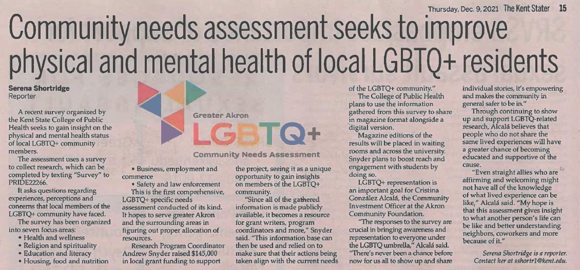 The College of Public Health at Kent State University led by Andrew M. Snyder has the unique opportunity to positively impact the health outcomes of lesbian, gay, bisexual, transgender and queer (LGBTQ+) residents in the Greater Akron area as well as contributing to public health evidence-based practice throughout Ohio and the United States through a first-time comprehensive LGBTQ+ specific community needs assessment.